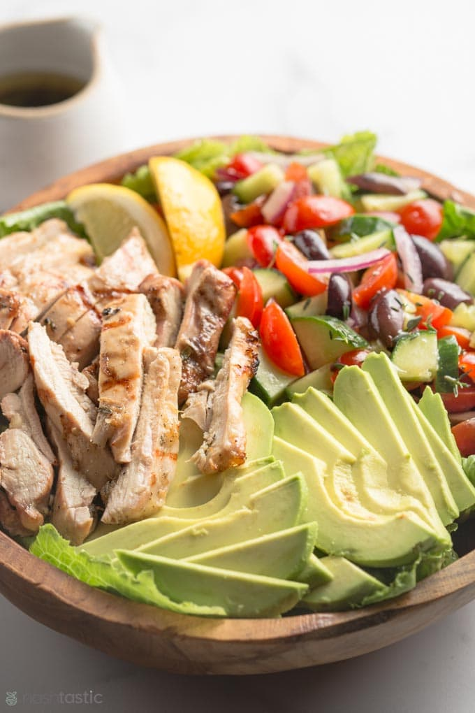 - Step 5: Build your bowl. Start with the greens, add your sliced chicken, then scatter the tomatoes, cucumbers, onions, olives, and feta on top. Drizzle with that delicious dressing.