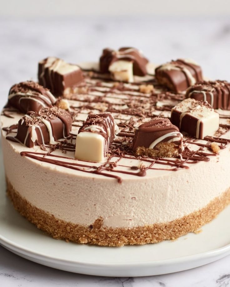 Once fully set, carefully release the springform pan. Drizzle melted milk and white chocolate over the top in a crisscross pattern. Arrange the halved Kinder Bueno bars around the edge or across the center. Sprinkle crushed hazelnuts and pipe whipped cream rosettes for an elegant finishing touch.